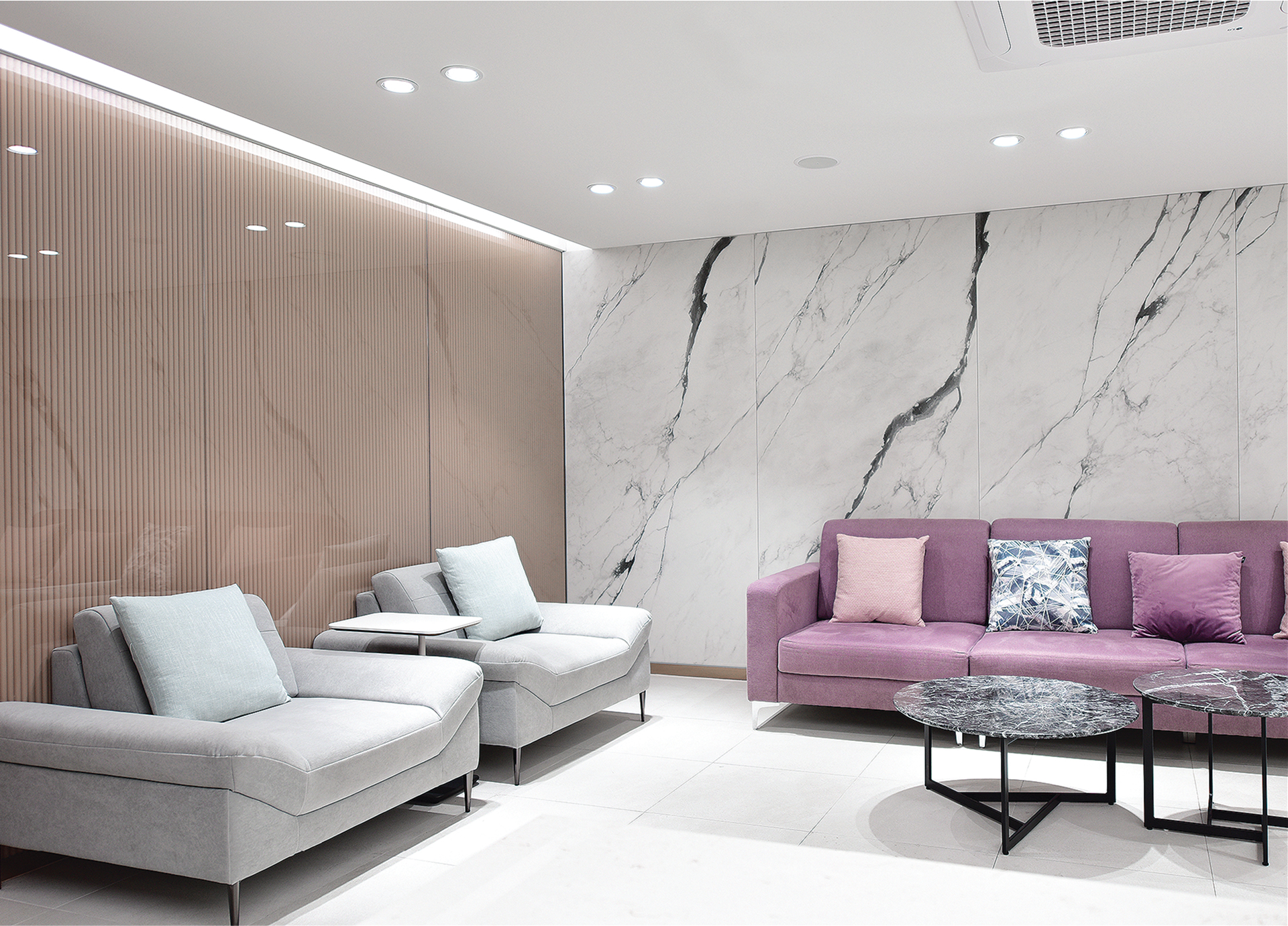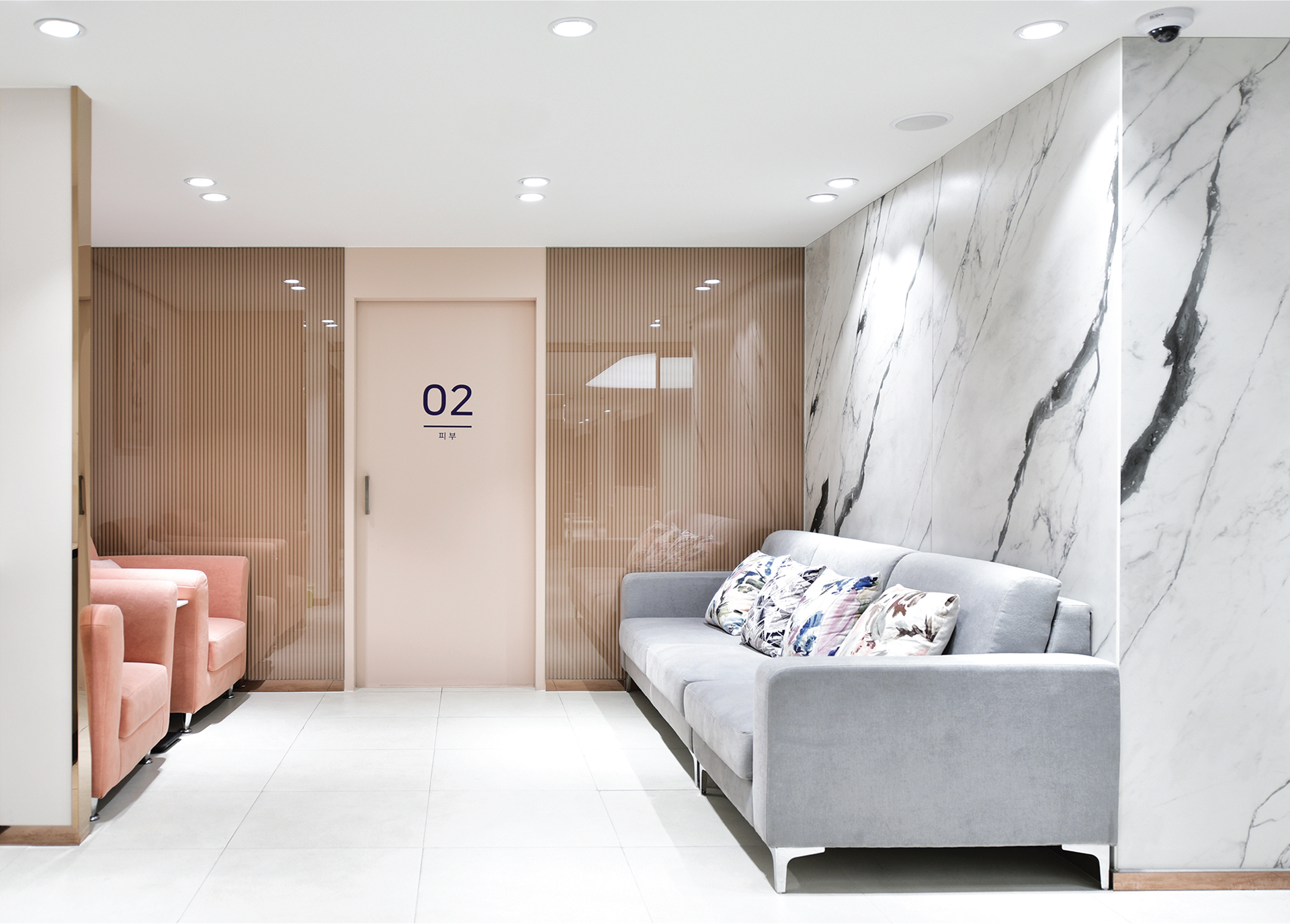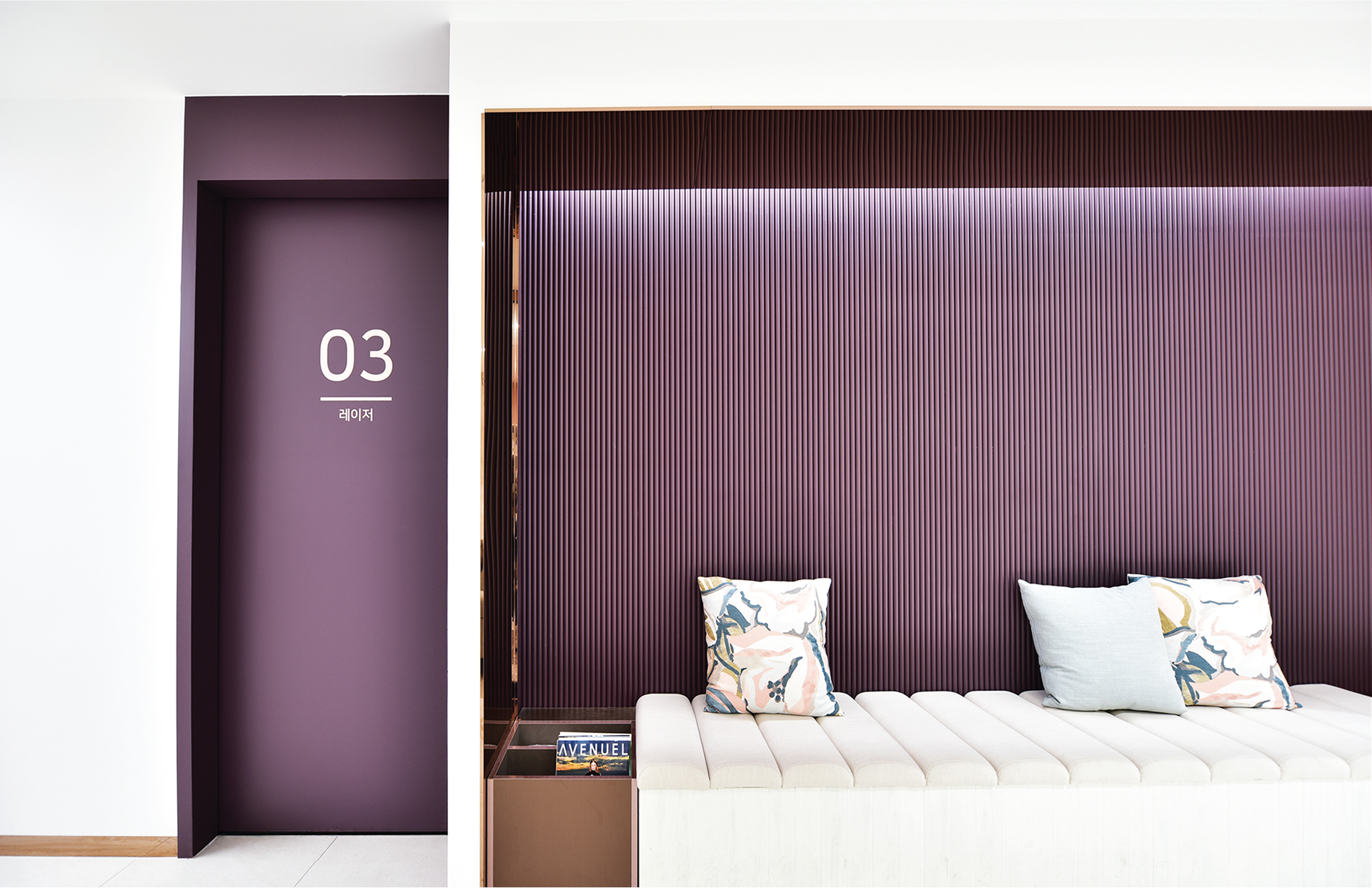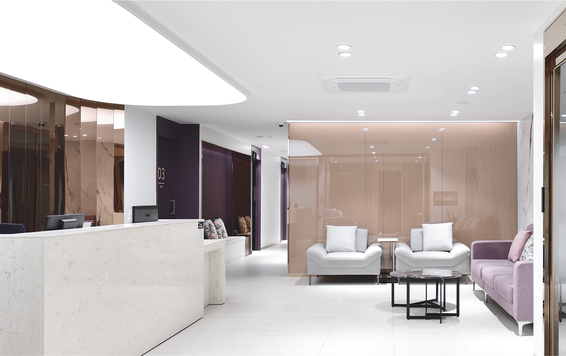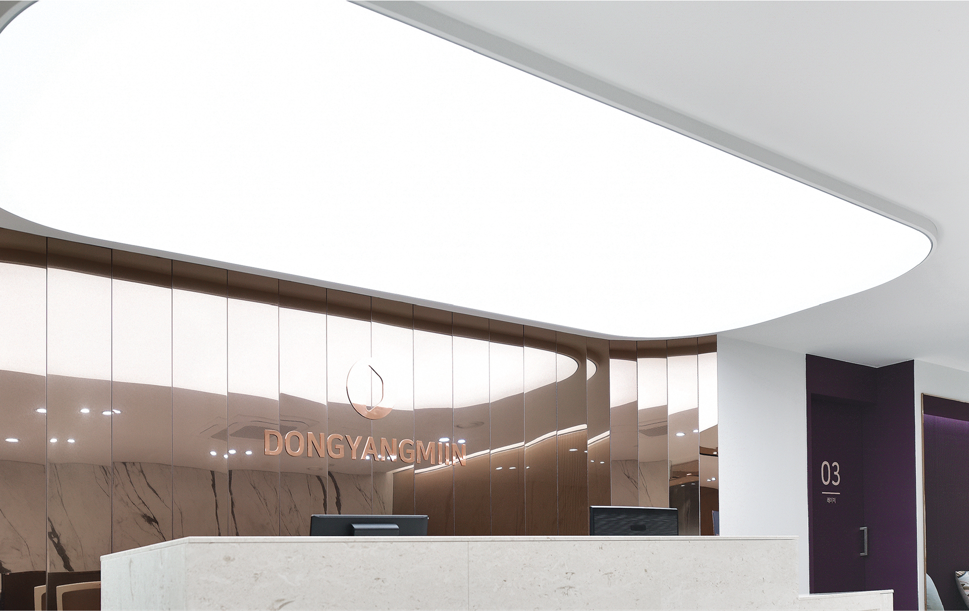 동양미인은 단순한 시술 공간을 넘어, 브랜드의 미학과 고객의 감성을 담아낸 프라이빗하고 감각적인 공간으로 완성되었습니다. 곡선형 조명과 입체 패널은 부드럽고 차분한 첫인상을 남기며, 딥 퍼플과 자연석 질감의 세라믹은 고급 스러운 긴장감을 더합니다. 각기 다른 소재의 조화는 정제된 아름다움과 섬세한 디테일을 담아내며, 고객의 심리적 안정과 브랜드 경험을 동시에 제공합니다.
